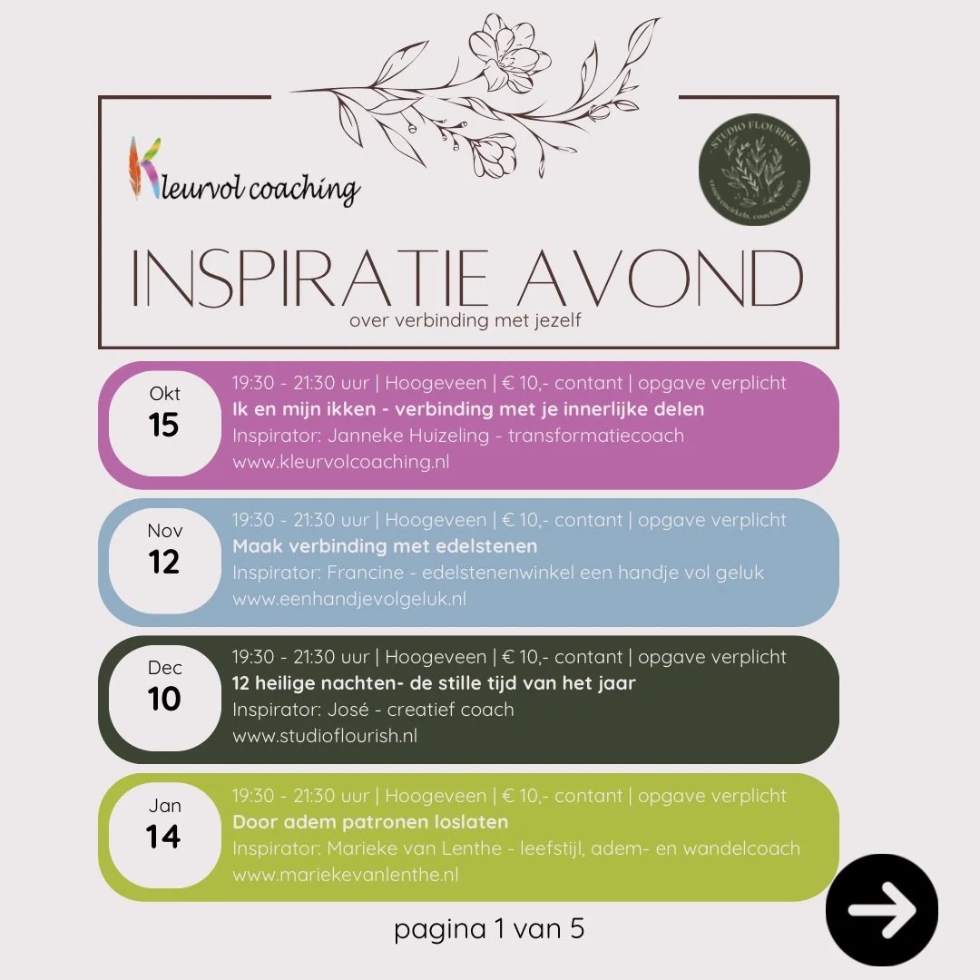 Er is natuurlijk heel veel te ontdekken, maar hoe weet je nu of iets bij je past? Of heb je er eens van gehoord en wil je er meer over weten? Tijdens de inspiratieavonden vertellen mede coaches, therapeuten en enthousiastelingen in de rol van inspirator, over een onderwerp/thema of manier die jou kan helpen ontwikkelen en dichterbij jezelf zou kunnen laten komen. Zo kan je helemaal vrijblijvend eens proeven en kennismaken .