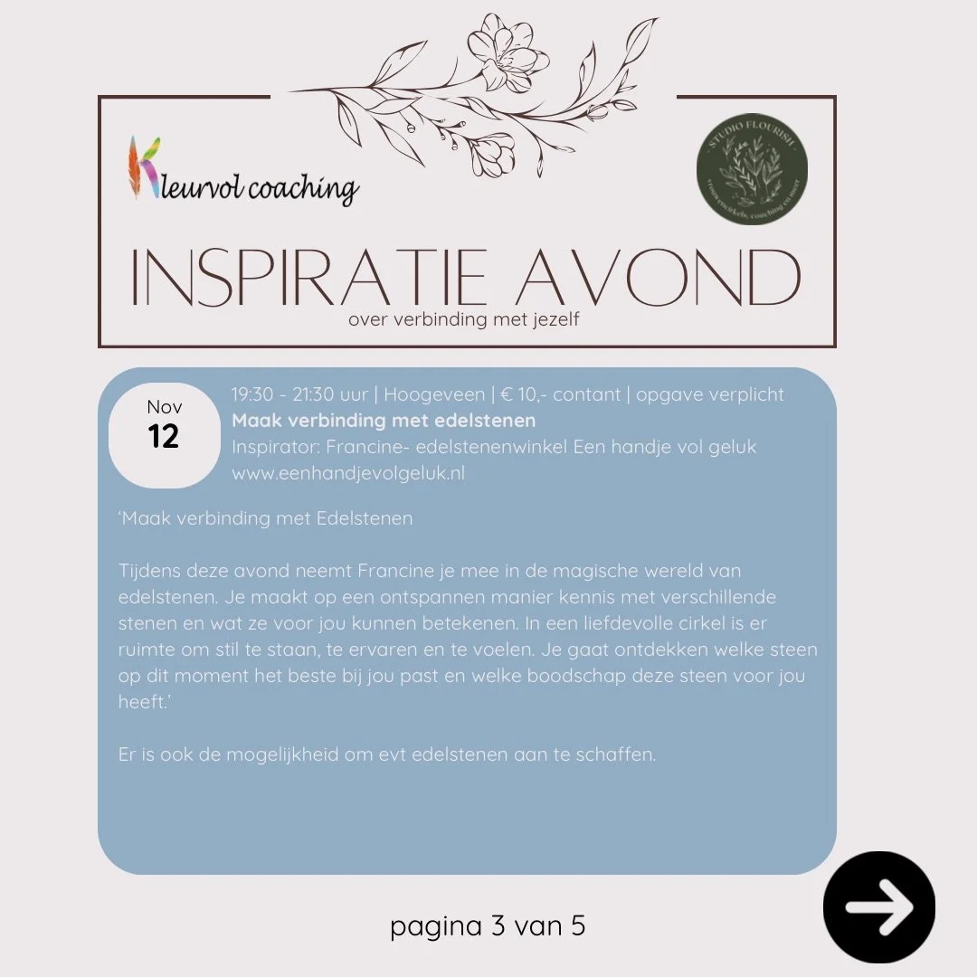 Met precies dit als doel zijn de inspiratie avonden ontstaan. Op een laagdrempelige manier kennis maken met verschillende manieren, mensen en hun kennis en kunde over manieren om verbinding met jezelf te maken en daarin te kunnen ontwikkelen.