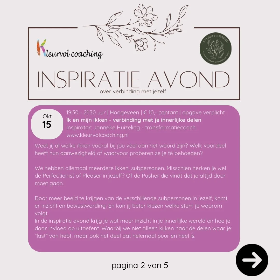 Weet jij al welke ikken vooral bij jou veel aan het woord zijn? Welk voordeel heeft hun aanwezigheid of waarvoor proberen ze je te behoeden? We hebben allemaal meerdere ikken, subpersonen. Misschien herken je wel de Perfectionist of Pleaser in jezelf? Of de Pusher die vindt dat je altijd door moet gaan. Door meer beeld te krijgen van de verschillende subpersonen in jezelf, komt er inzicht en bewustwording. En kun jij beter kiezen welke stem je waarom volgt. In de inspiratie avond krijg je wat meer inzicht in je innerlijke wereld en hoe je daar invloed op uitoefent. Waarbij we niet alleen kijken naar de delen waar je “last” van hebt, maar ook het deel dat helemaal puur en heel is.